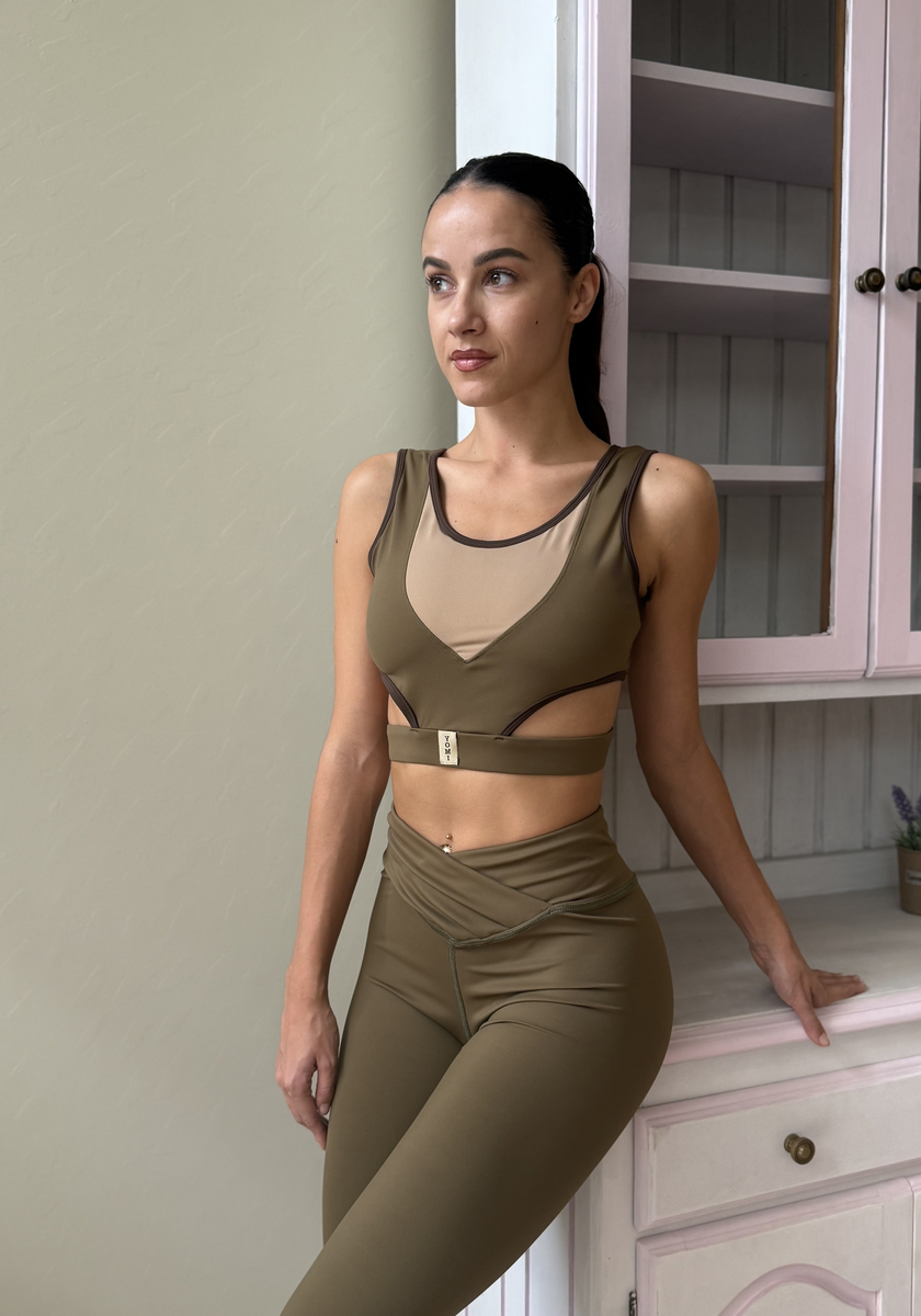 Ένα από τα πιο εντυπωσιακά κομμάτια της συλλογής, το Vital Cut-Out Top (Olive) συνδυάζει δυναμισμό και κομψότητα. Το εφέ V στο μπροστινό μέρος και οι cut-out λεπτομέρειες στα πλάγια δημιουργούν ένα σχέδιο που αγκαλιάζει το σώμα και αναδεικνύει το μπούστο.